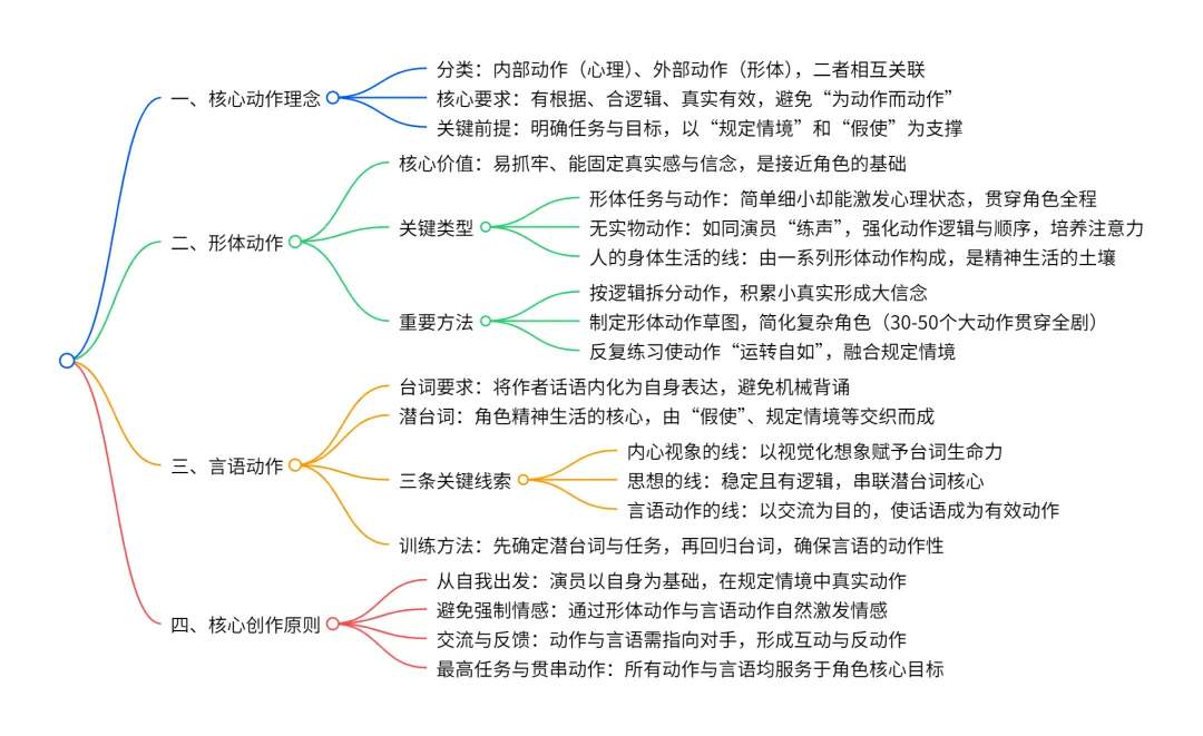 因为形体动作比心理动作容易抓住,它较之那不可捉摸的内心感觉要容易接近些;因为形体动作比较便于固定下来,它是物质的,看得见的;因为形体动作同其他一切元素都有联系。实际上,没有什么形体动作不带有欲望、意向和任务,不由情感为其提供内在根据的;没有什么想象虚构不带有这种或那种想象中的动作;而在创作中也根本不应该有这样的形体动作——不应该有对其真实性缺乏信念因而在其中感觉不到真实的形体动作。