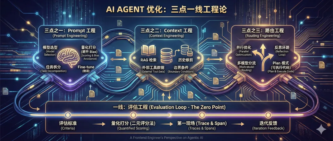 吴恩达说,做 Agent 就像做软件,需要不断迭代。我总结了一个“三点一线”优化模型:评估工程(一线)串联起 Prompt、Context、路由(三点)。