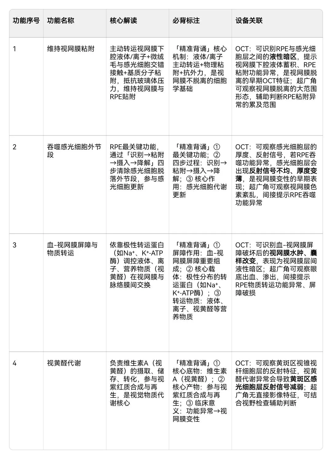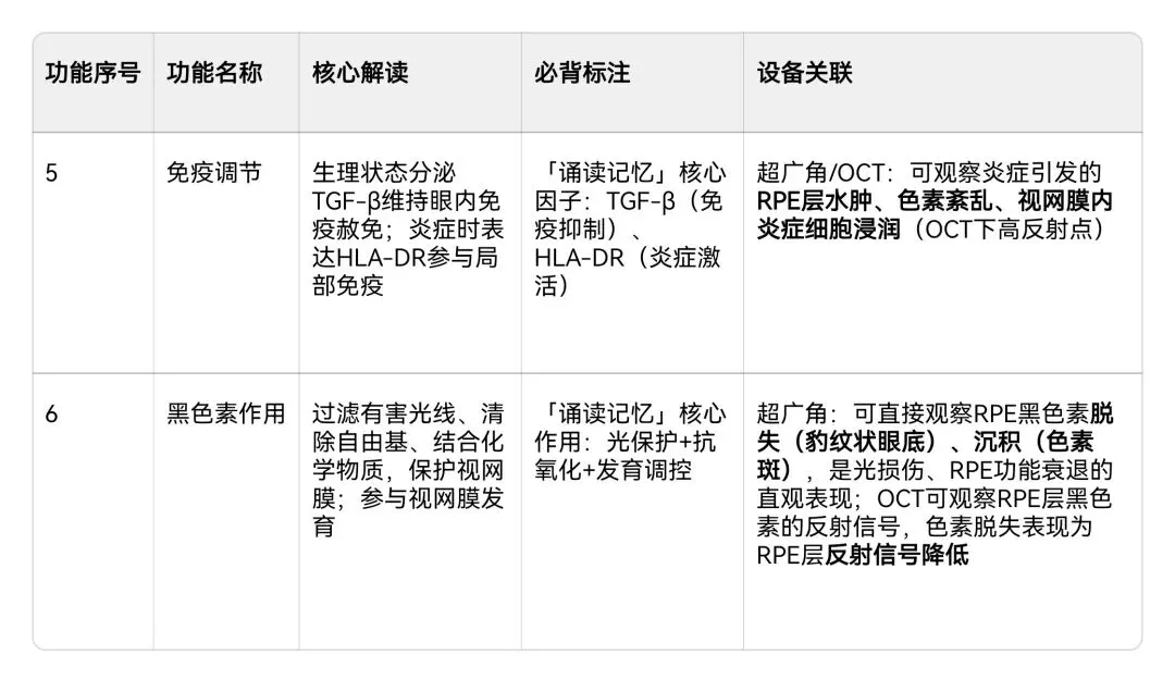 RPE的6大功能是眼底视觉维持的关键,前4项为核心功能,需精准背诵,后2项诵读记忆即可,所有功能异常均能通过OCT/超广角捕捉间接/直接影像特征。