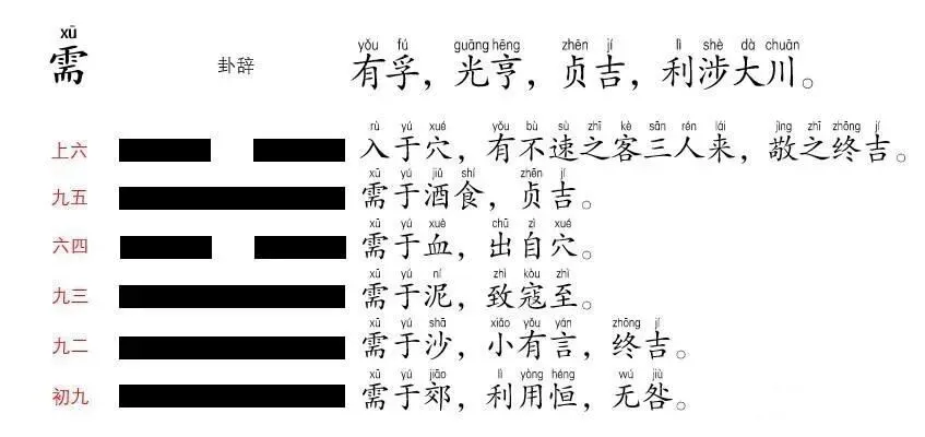 马振彪曰:易一卦多义,未可执一而求。需有待义、有敬意、有养义、有求义,皆于爻象中括之。初与二不冒险轻进,是待而需也;三致寇不败,是敬而需也:四顺以听,是自养而需也;五酒食贞吉,是养贤以应天下之需求也。是皆得需道之善者,若上则不需而亦无大失,终不外乎敬矣。