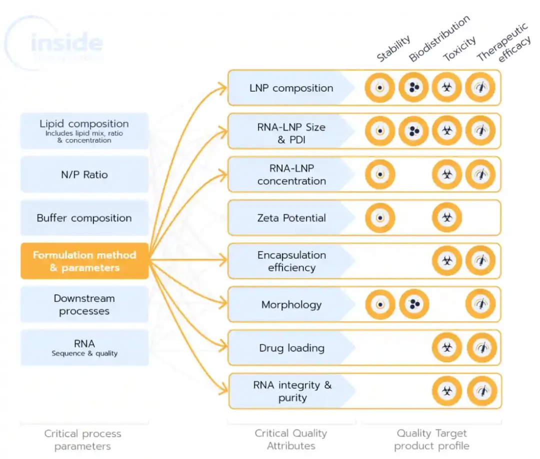 LNP的成功研发依赖于多种因素的结合,包括合适脂质的选择,它们的比例和浓度。但是,制剂过程本身也同样重要,它直接影响纳米颗粒的关键质量属性(CQA),例如粒径、多分散指数(PDI)、封装效率、产率和形态。反之,这些CQA又在决定药品的药代动力学、细胞摄取、毒性和总体疗效方面起关键作用。