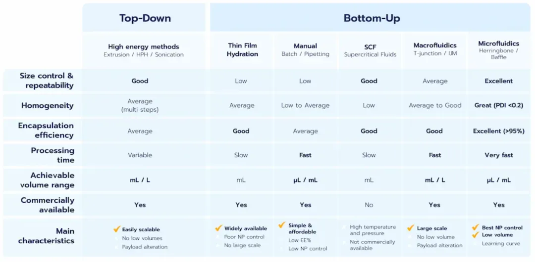 总体而言,这些方法的优势在于大规模应用。然而,系统中涉及的高能量可能导致脂质或核酸发生改变,因此不适用于生物领域的可持续应用。另外,它们的封装效率较低,且在小体积制剂(<毫升)方面存在困难。