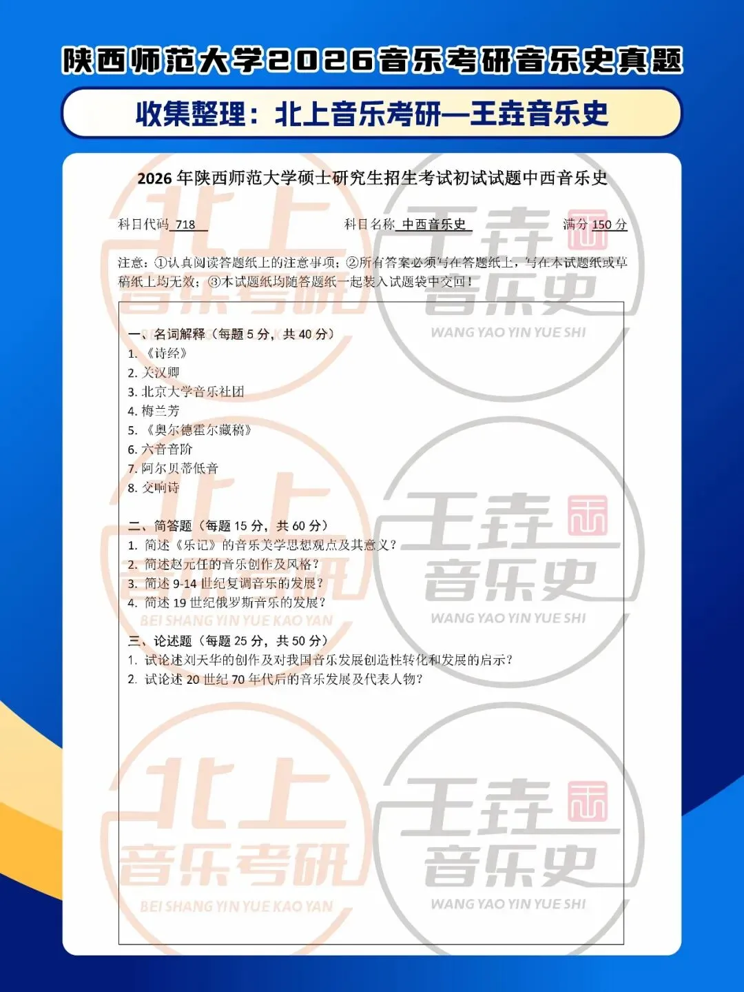 陕西师范大学2026音乐考研音乐史真题|北上音乐考研-王垚音乐史工作室收集整理