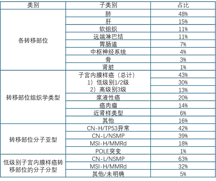 远处转移性EC主要为复发(84%),最常见转移部位是肺(48%),组织学以子宫内膜样癌(43%)和浆液性癌(20%)为主,分子亚型主要为CN-H/TP53异常(42%)和CN-L/NSMP(39%),低级别子宫内膜样癌转移多为CN-L/NSMP(63%)和MSI-H/MMRd(32%)。