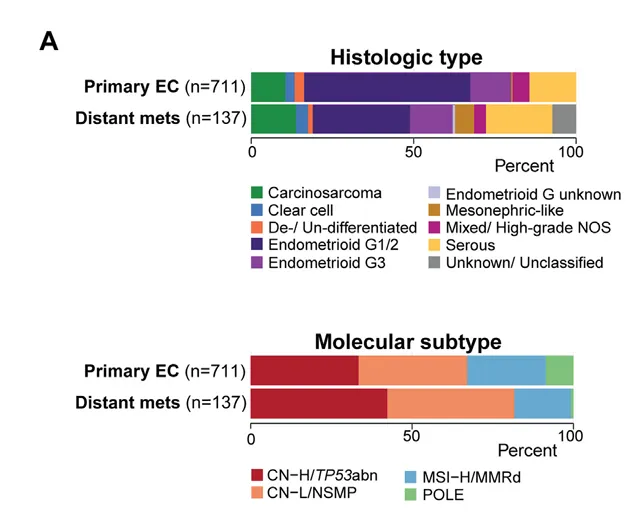 1. 远处转移 EC 最常见分子亚型:CN-H/TP53abn 和 CN-L/NSMP。
