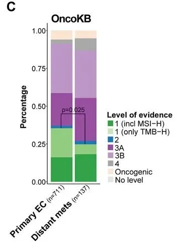5. 临床可操作突变:原发性EC更常见(37% vs 27%,p=0.025),包括MSI-H和高TMB。
