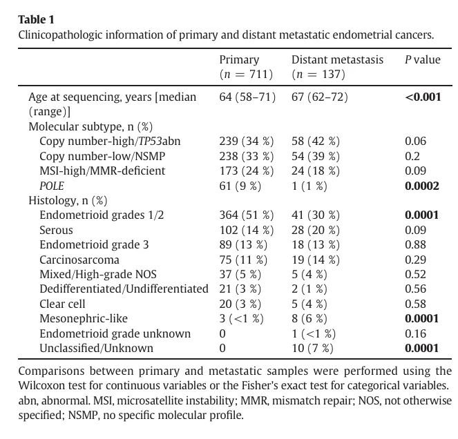 3. 分子亚型:CN-H/TP53异常、CN-L/NSMP和MSI-H/MMRd分布无显著差异,但POLE型在转移灶中极少见(1例 vs 9%,p=0.002),符合其低复发风险。