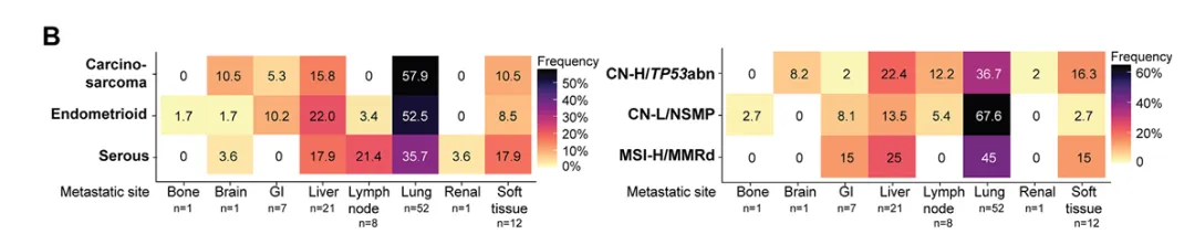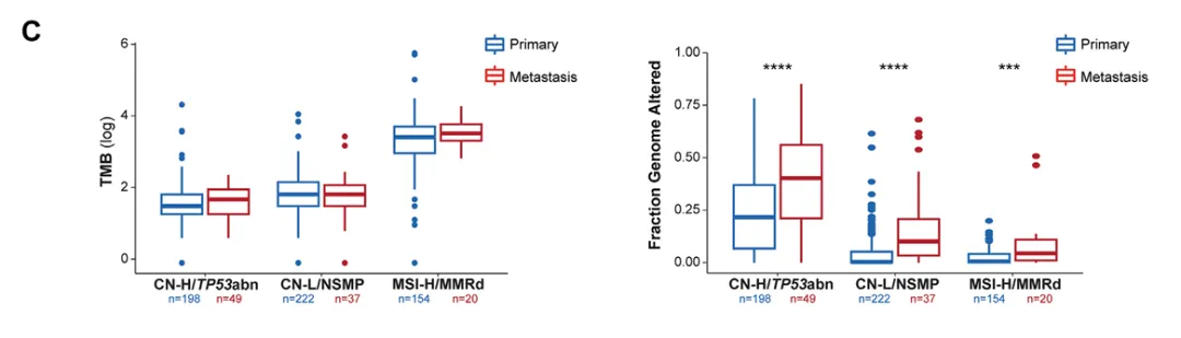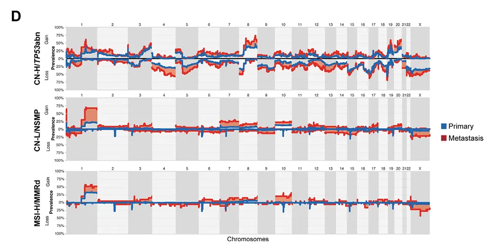 2) 但在CN-L/NSMP和MSI-H/MMRd亚型中,转移灶显著富集:
