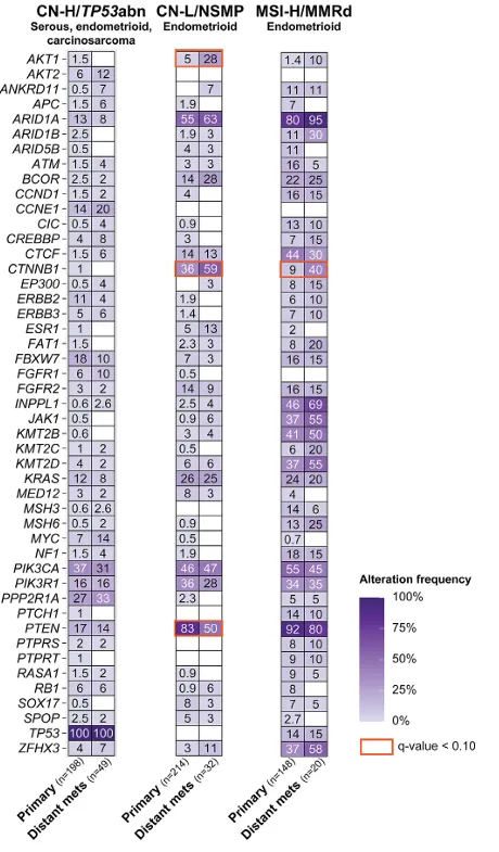 c. PTEN突变:CN-L/NSMP原发灶更常见(83% vs 50%,q<0.01)
