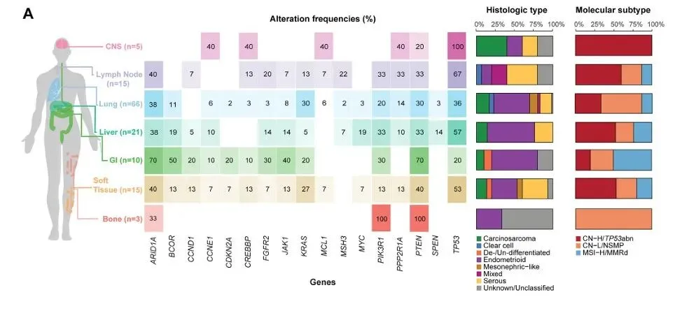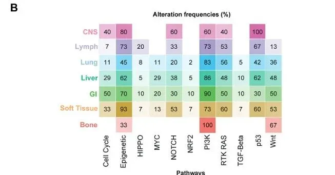2.CNS 转移几乎全部携带 TP53 突变,而 GI 转移仅少数有 TP53 突变,骨转移则完全缺失该突变。