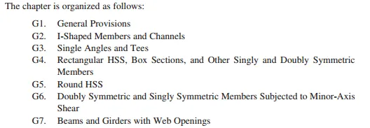 | G1: 一般规定 G2: 工字型截面构件及槽钢 G3: 单角钢及T型钢 G4: 方形和矩形HSS及箱形截面及其他截面对称构件 G5: 圆形HSS G6: 弱轴受剪的截面对称构件 G7: 腹板开孔的梁和主梁 |