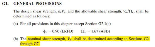 其实已经很熟悉AISC 的行文逻辑了,上来先明确两种设计方法对应的名义抗剪强度Vn,除了热轧I-Shaped members的名义抗剪强度换算与双轨设计方法的系数详见G2.1(a),其他截面的Vn都通过下图进行计算: