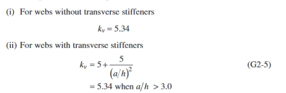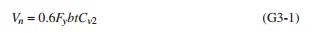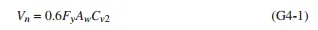 本节中的G2.1中首先明确了如何计算腹板的抗剪强度公式G2-1,其中引入了系数Cv1(web shear strength coefficient),腹板剪切强度系数,通过腹板的剪切屈曲能力,通过腹板高厚度h/tw的不同区间使用不同计算公式来折减腹板的抗剪强度。(公式G2-2~G2-4)。