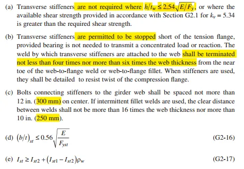 G2.4的内容就是对腹板的横向加劲肋做了明确的条文说明,包括是否需要设置transverse stiffeners的高厚比要求(G2.4a);加劲肋设置的构造要求(G2.4b);其中分别对用螺栓连接和焊接连接的加劲肋明确了具体连接的要求(G2.4c);提出了加劲肋的宽厚比限制(G2.4d);给出了横向加劲肋的惯性矩的计算公式(G2.4e)。
