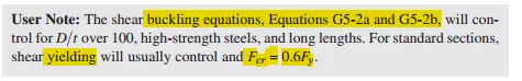 本节分别从剪切屈服和剪切屈曲两个极限状态来定义圆形HSS的抗剪强度Vn,不同D/t会影响round HSS是先出现屈服还是屈曲,从而会导致抗剪强度是由yielding控制还是buckling控制,详见公式G5-2和user note里的0.6Fy。