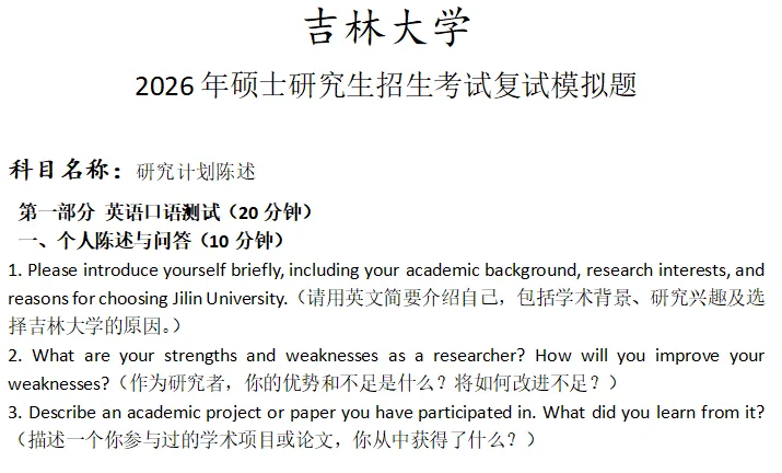 吉林大学研究计划陈述考研复试真题模拟含答案