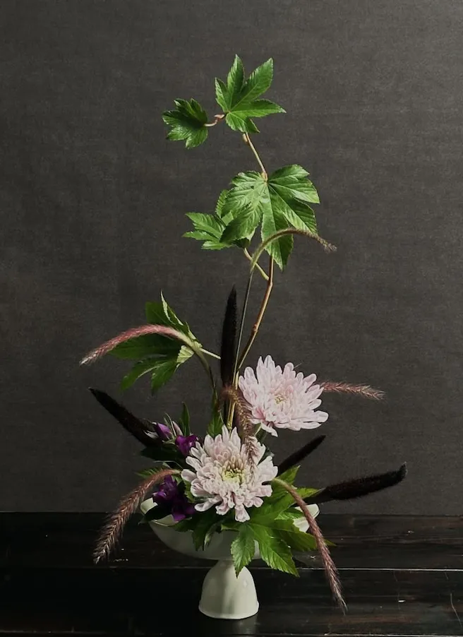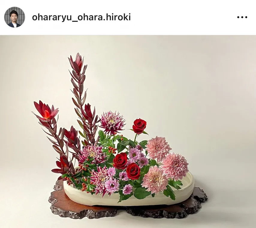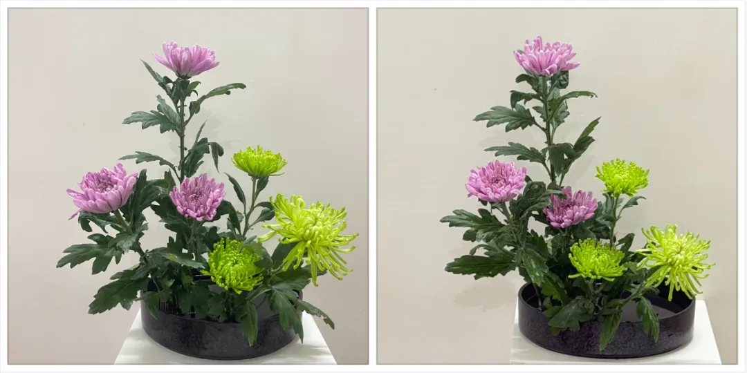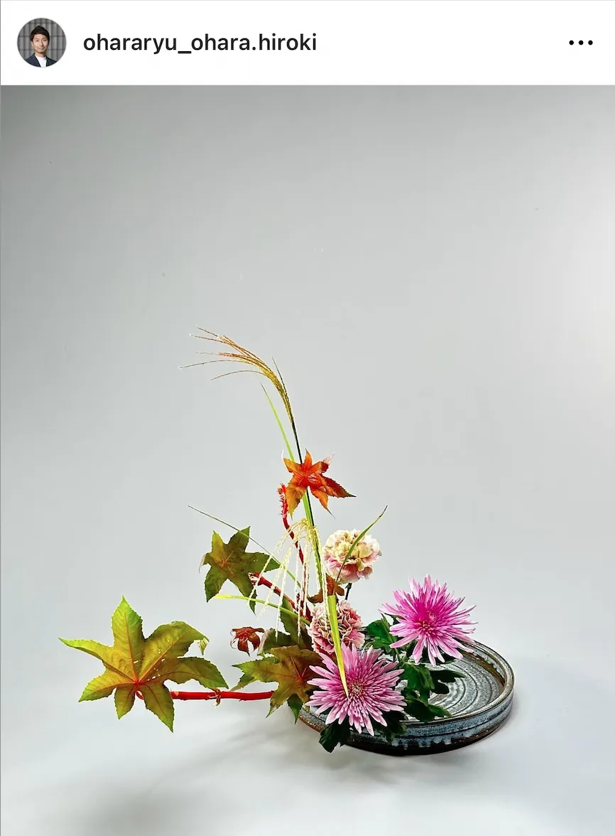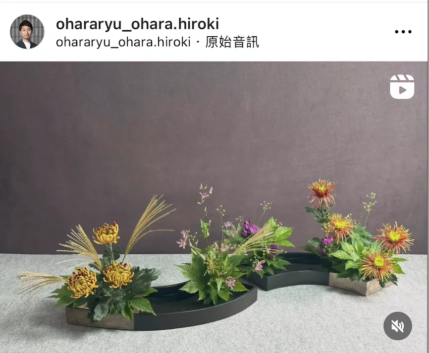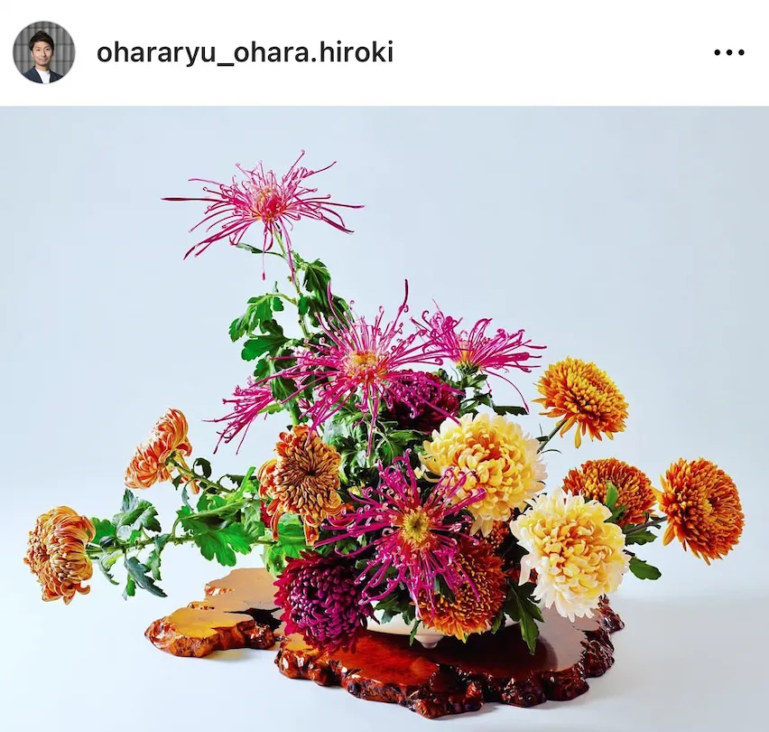 回到小原流,翻看家元发上ins的作品,菊的含量非常高。菊的品类繁多,可以用在各种不一样的形制上。👇