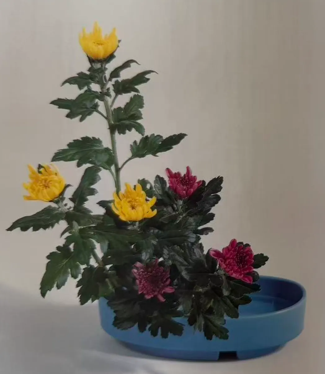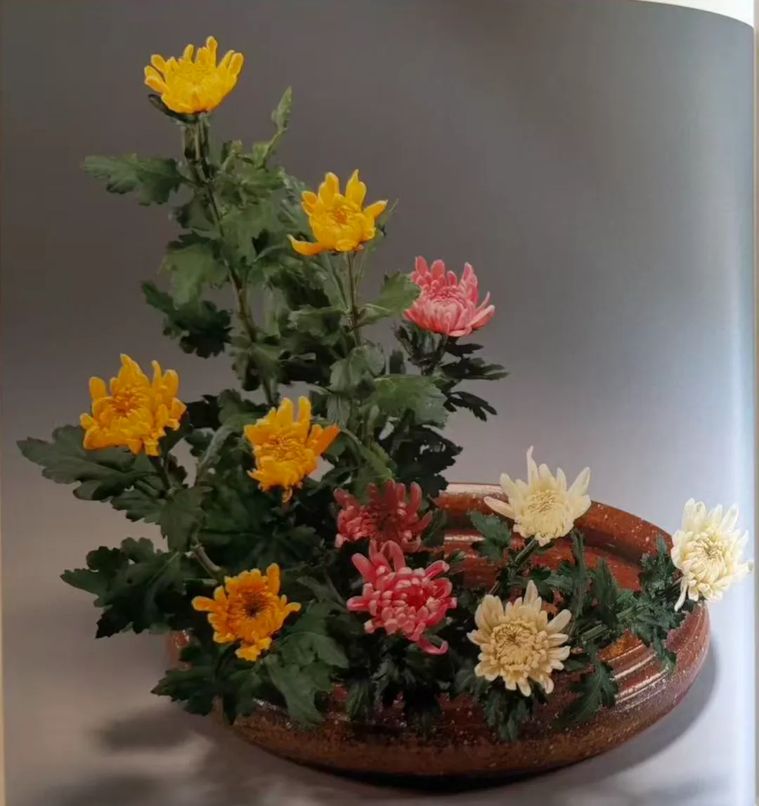 欣赏完masterpieces,从学习的角度,怎么开始呢?我们学过的花型、花式当然都可以用来插菊花。同时,菊还有其样式本位,称为“菊三种”。- 日本喜欢单数,所以所用的菊的种类也是1、3、5、7、9、11,每种菊用的数量也基本是单数。