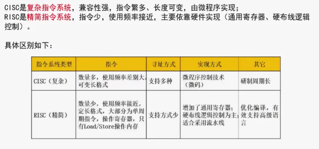 | 数量少,使用频率接近,定长格式,大部分为单周期指定,操作寄存器,只有Load/Store操作内存 | | 增加了通用寄存器;硬布线逻辑控制为主;适合采用流水线 | |