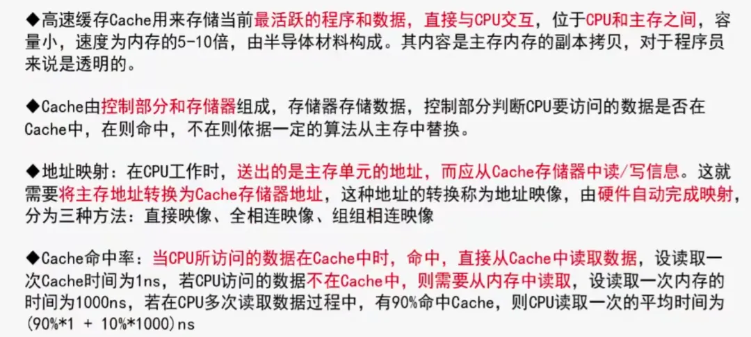 如果以h代表对Cache的访问命中率,表示Cache的周期时间,表示主存储器周期时间,以读操作为例,使用“Cache+主存储器”的系统的平均周期为,则:$${{t_3}}=h*t_1+(1-h)*t2$$其中,(1-h)又称为失效率(未命中率)。