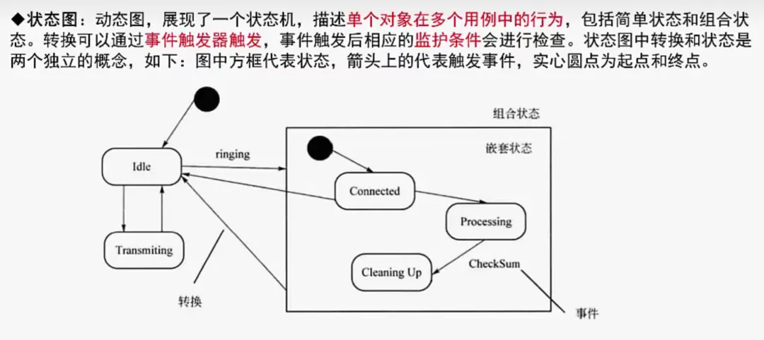 状态图(state diagram)。状态图描述一个状态机,它由状态、转移、事件和活动组成。状态图给出了对象的动态视图。它对于接口、类或协作的行为建模尤为重要,而且它强调事件导致的对象行为,这非常有助于对反应式系统建模。