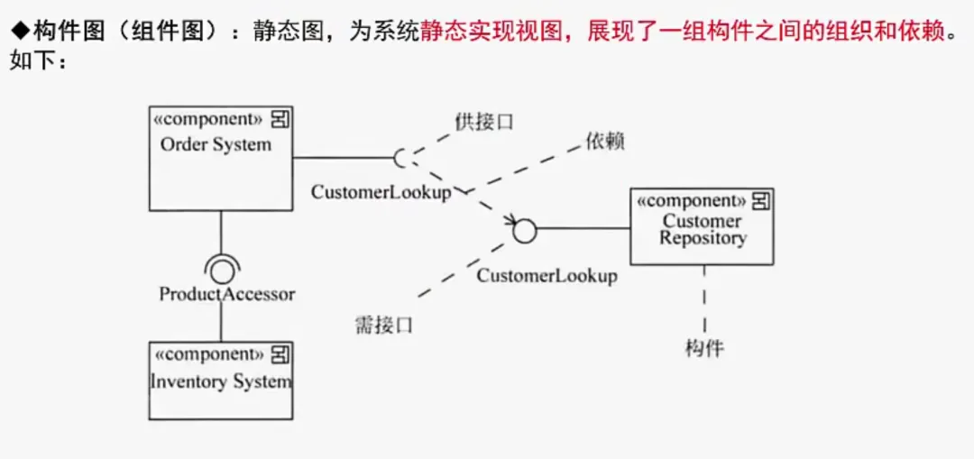 构件图(component diagram)。构件图描述一个封装的类和它的接口、端口,以及由内嵌的构件和连接件构成的内部结构。构件图用于表示系统的静态设计实现视图。对于由小的部件构建大的系统来说,构件图是很重要的。构件图是类图的变体。