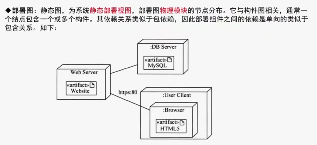 部署图(deployment diagram)。部署图描述对运行时的处理节点及在其中生存的构件的配置。部署图给出了架构的静态部署视图,通常一个节点包含一个或多个部署图。
