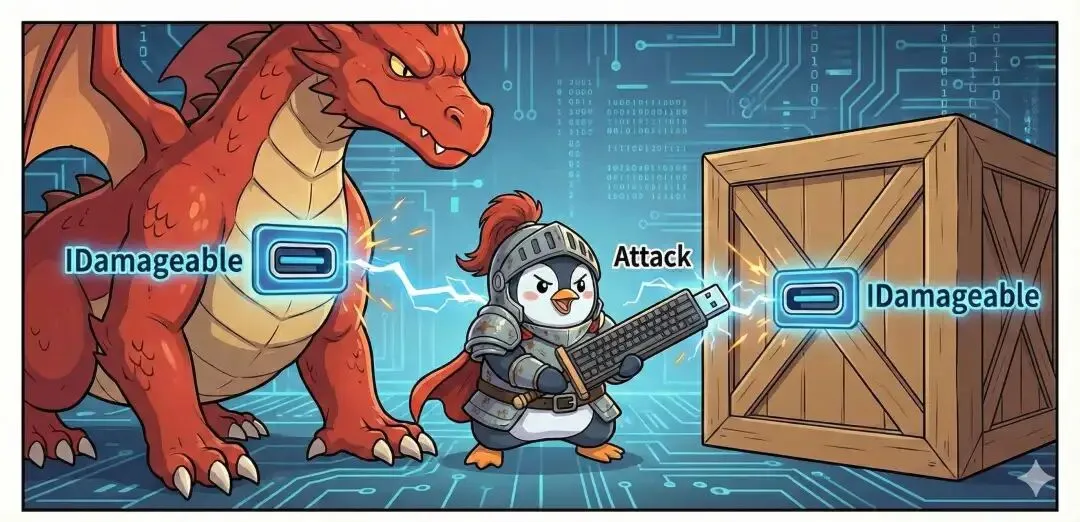 // 箱子也能签(它跟 Monster 没任何血缘关系)publicclassWoodenBox : IDamageable{publicint Durability = 50;publicvoidTakeDamage(int amount) { Durability -= amount; Console.WriteLine("箱子碎成了木屑!"); }}