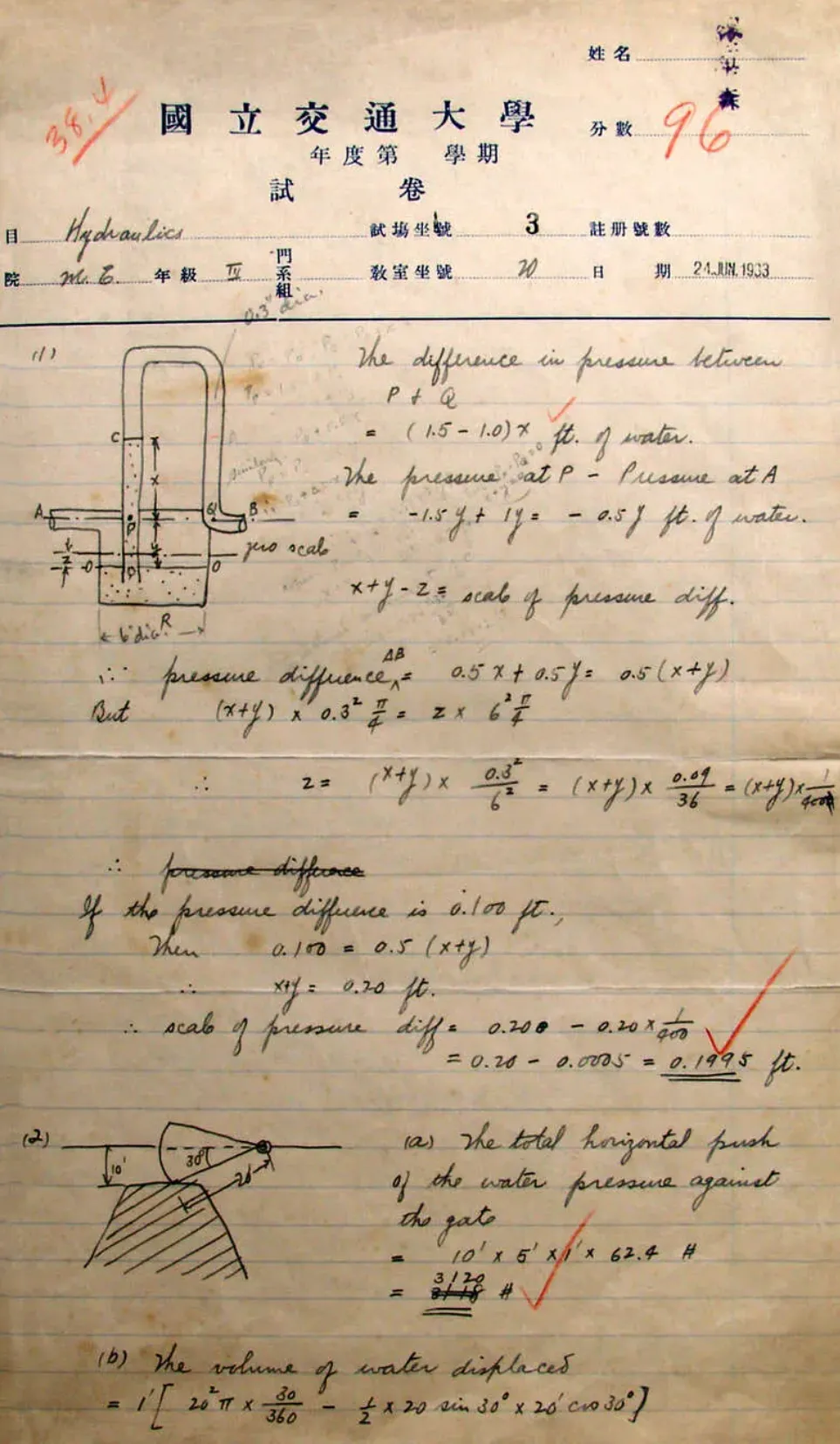1980年,钱学森大学时期的水力学老师金悫将一份保存了近50年的考卷通过校史研究人员陈贻芳捐给了上海交通大学。这份试卷的卷首时间为1933年6月,课程是水力学(Hydraulics)。这份考卷书写工整,整洁漂亮,连等号“=”都像是用直尺画的一样,中英文字写得秀丽端庄。