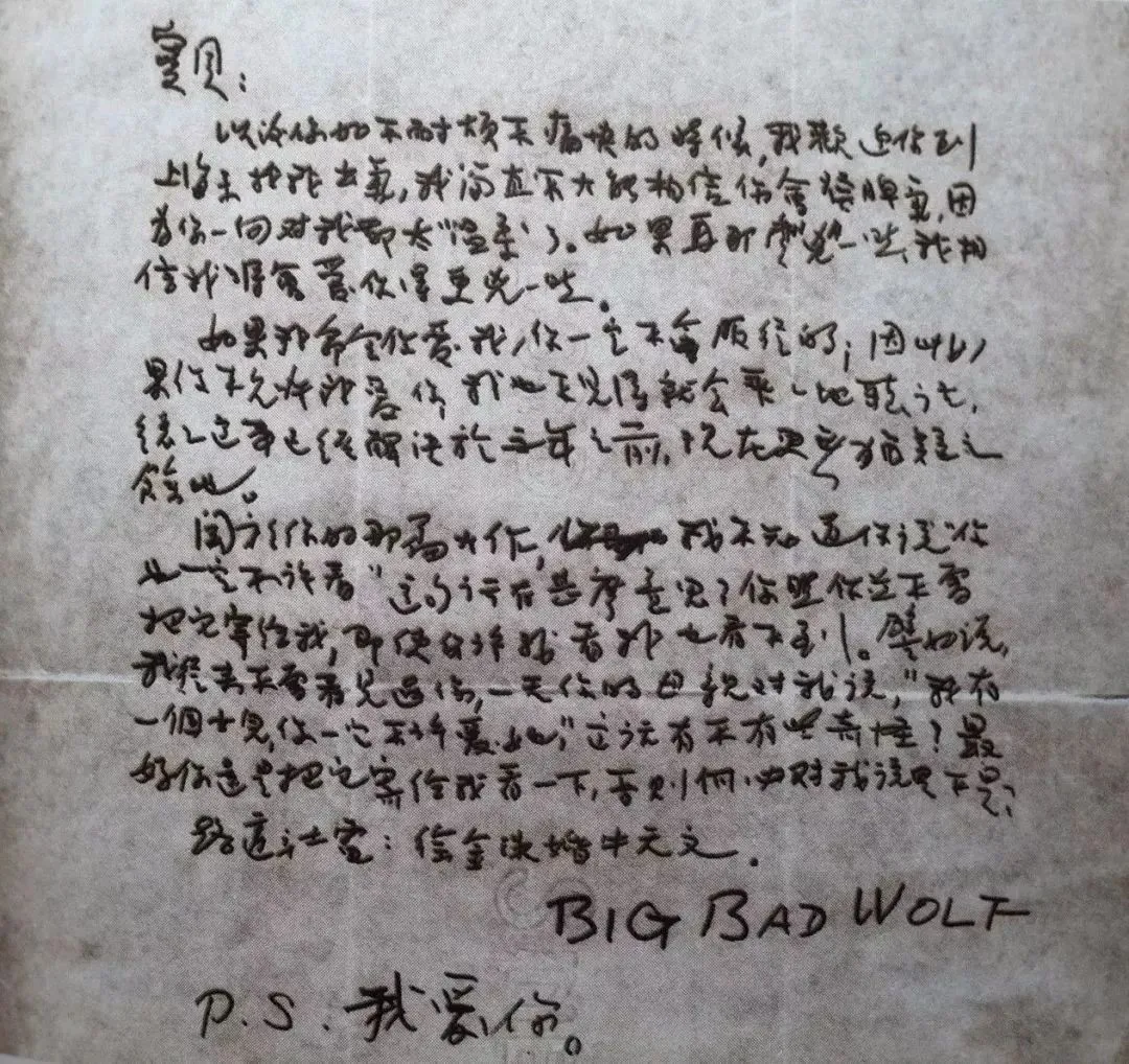 在下面这封信里,朱生豪称宋清如为“宝贝”,并给自己的落款写为“Big Bad Wolf(大坏狼)”,结尾还不忘带上一句“我爱你”。