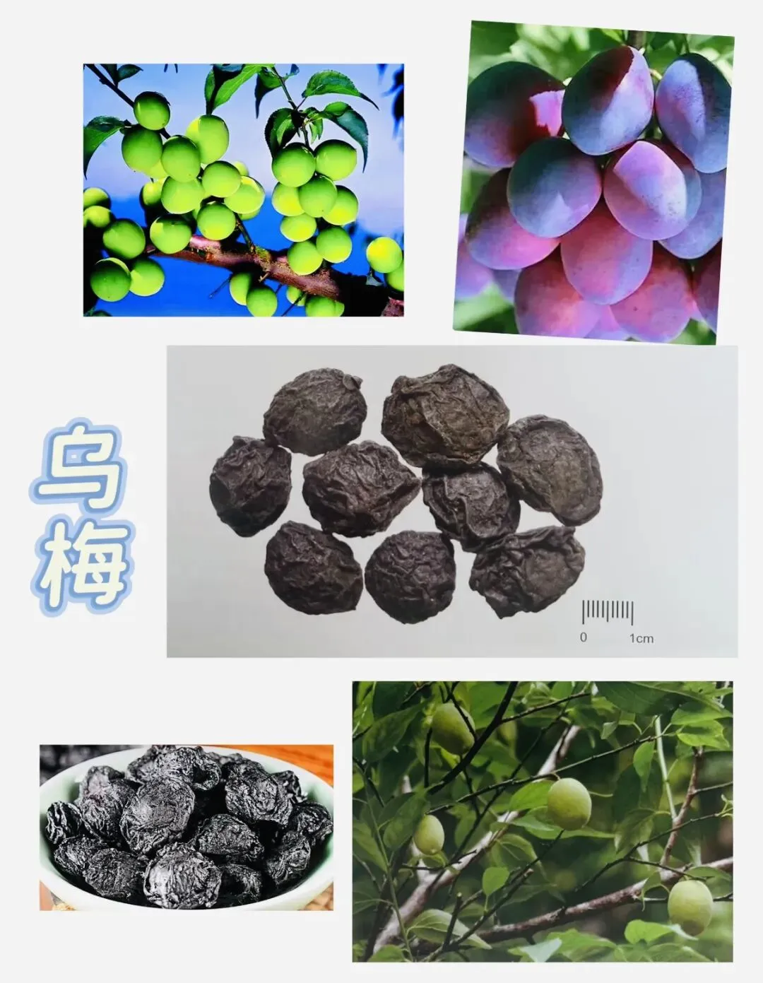 科属:蔷薇科植物梅的干燥近成熟果实,经低温熏焙至色变黑。