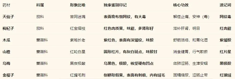 味甘甜、色红润 → 枸杞子(茄科滋补)。