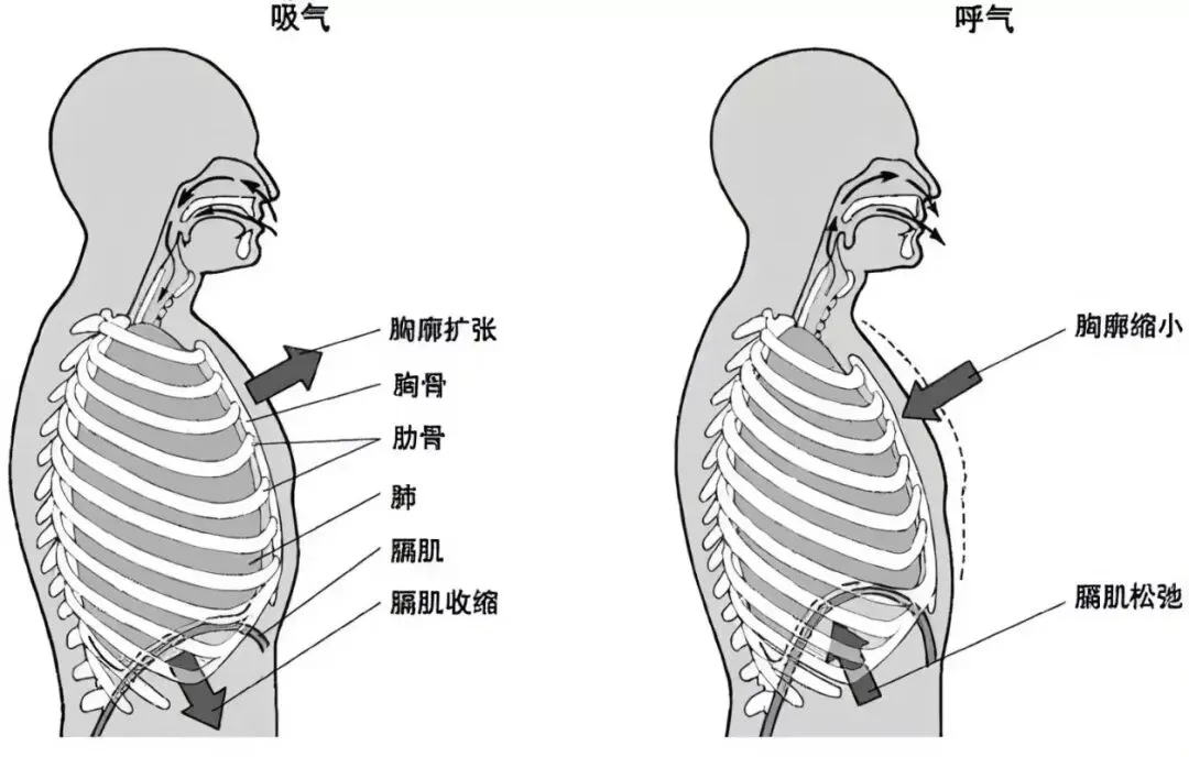 呼气时,肺容积减小,压力升高,肋骨下降,膈肌上升,胸廓容积减小。这正是完成举臂、后伸等动作的时机。