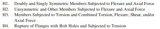 | H1: 受到轴向力和弯曲同时作用的单向和双向截面对称的构件 H2: 非对称和其他构件在弯曲和轴向力作用下的设计 H3: 受到扭转或组合作用(扭转、弯曲、剪力、轴向力)的构件 H4: 带螺栓孔的翼缘在拉伸作用下的断裂 |