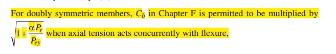 H1.2同时受到拉弯作用的单向或双向对称截面的构件,这一小篇章虽然是受到拉弯作用,但是与压弯作用使用一样的H1-1a和H1-1b,但是的区别在于其中的Pc,压弯构件的Pc取章节E中,拉弯构件Pc取章节D。其实从这一章开始,多了和之前DEF章节的联动,很多都是在不同类型的受力同时产生的时候,补充了很多需要系数的复核计算。