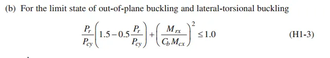 H1.3同时受到单轴压弯作用的双向热轧截面,这其实是H1.1的特殊情况,即侧向无支撑长度要小于y向弯曲屈曲有效长度,感觉很拗口,首先要明确这里的x,y其实强轴和弱轴的概念,限制Lcz≤Lcy的实际意义其实就是限制构件的扭转屈曲先于弯曲屈曲,而y轴的屈曲荷载较小,所以限制y轴是保守设计的体现。当满足这个条件时,可以从instability in-plane和buckling out-of-plane进行区别简化,适当简化考虑组合力的作用,平面内不稳定仍然使用H1-1a/b,平面外屈曲可以使用公式H1-3。