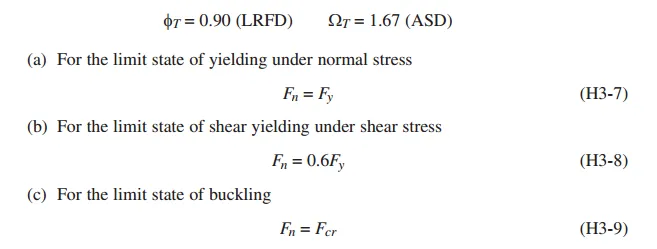 H3.3受扭转和组合作用的非HSS构件,the available torsional strength取正应力屈服(yielding under normal stress)、剪切屈服(shear yielding under shear stress)、屈曲(buckling)的最小值,确保了构件在这三种可能得破坏模式下都有足够的安全储备能力。