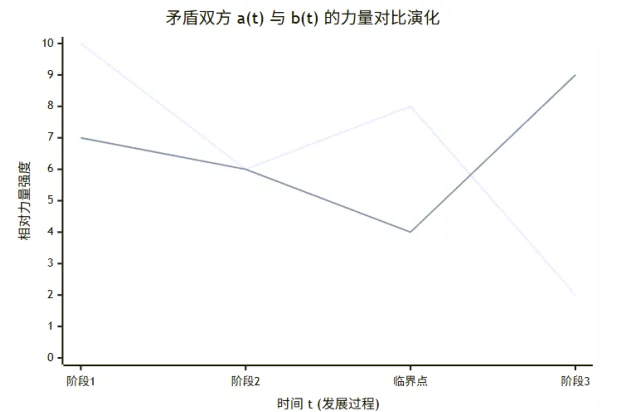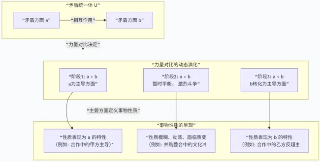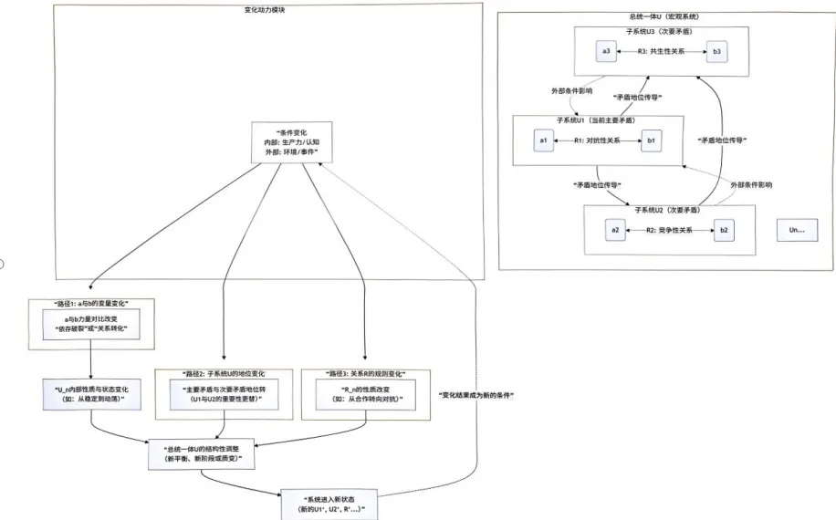 路径1(a/b → U):矛盾双方a、b的力量变化(如强弱易位)会首先引发其所在的子统一体Un内部状态的改变,即事物性质的改变(如从稳定走向动荡)。路径2(U地位):条件变化会导致不同子统一体的重要性排序更替。原先的主要矛盾U1可能降级,次要矛盾U2可能上升成为新的主要矛盾。路径3(R规则):矛盾双方相互作用的关系R本身也会发生质变(如从合作变为竞争对抗)。3. 系统的整体演进与反馈