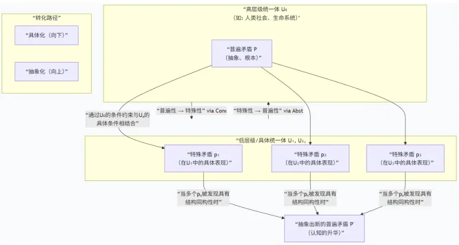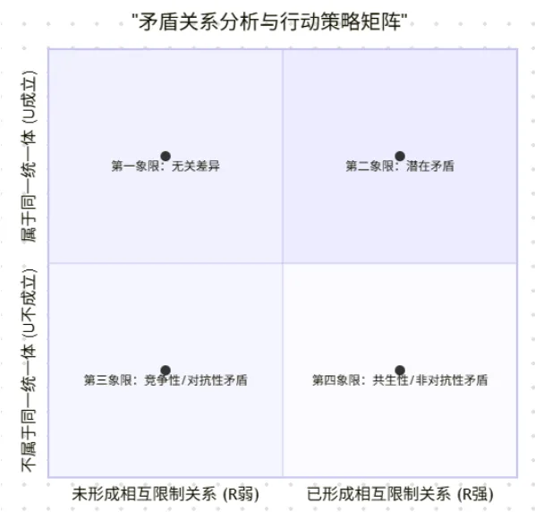 - 任何运动形式,其内部都包含着本身特殊的矛盾。这种特殊的矛盾,就构成一事物区别于他事物的特殊的本质(与“差异即矛盾”公式的关系:矛盾(a, b) = (a ∈ U) ∧ (b ∈ U) ∧ R(a, b, U)。“特殊的矛盾” 就体现在那个特殊的统一体(U) 和特殊的关系(R) 之中。分析特殊性,就是具体地界定U和R。与“四象限”工具的关系:象限帮你初步分类矛盾(对抗/非对抗等),但特殊性原理要求你在同一象限内,进一步识别每个矛盾的独特性。例如,同是“对抗性矛盾”(第三象限),劳资矛盾的处理方式,与两个竞品公司间的矛盾处理方式,因矛盾的特殊性不同,策略也截然不同)