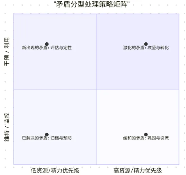 矛盾无处不在:从自然威胁到人际纷争,从内心挣扎到社会冲突,修行之路布满矛盾。认为出家便是“逃避矛盾进入净土”,是彻底的误解。无所谓净土,只有在矛盾中锻造出来的内心境界。正是克服自然艰苦,锻造了其坚韧不拔的品格;经历政治斗争,锤炼了其弘法护教的智慧与担当;应对社会冲突,促成了其圆融应机的方便;战胜内心魔障,最终成就了其戒行清净、慧光朗照的僧格。每一步提升,都以解决一个层次的矛盾为标志。4、如何理解差异就是矛盾:遵循差异→ 对立 → 冲突(激化)的发展过程,差异本身只是素材,只是对客观存在的区分;而矛盾关系是在差异识别的基础上展开的结构性判断。在矛盾关系表达式中R(a, b, U)中的a和b必须存在同一性和斗争性关系,矛盾关系才成立如黑色与白色:在颜色系统中,它们互为补色、彼此定义,存在关系R(相互排斥又依存),矛盾成立。又如黑色与巨大:不存在一个共同的、有意义的统一体使它们形成关系,矛盾不成立。启示:统一体是重要变量:对“统一体”的定义不同,判断结果会截然不同。分析矛盾,首先要问:“我是在哪个系统、哪个层面、哪种时间尺度下看问题?” 这是最重要的思维切换。关系®是对立统一的动态过程:矛盾关系不是静态的“不同”,而是动态的“相互作用”。既有激烈的利益对抗,也有暂时的温和的此消彼长,它们都是矛盾,但性质和解决方法完全不同。针对不同差异构成的矛盾及其强弱状态,需要不同的处理方法,设计象限工具如下:5、新过程的发生是什么呢?这是旧的统一和组成此统一的对立成分让位于新的统一和组成此统一的对立成分,于是新过程就代替旧过程而发生。旧过程完结了,新过程发生了。新过程又包含着新矛盾,开始它自己的矛盾发展史。(不要解决了一个主要问题就沾沾自喜,旧的矛盾解决了,马上会有新的矛盾产生,矛盾论如何指导我们进行心理和定力建设)矛盾的普遍性启示在于:不要内耗、矛盾无时无处不在;不要骄傲,旧矛盾消失,新矛盾产生!不要用单一、僵化、本能的方式去处理一切差异,不同差异构成的不同矛盾需要不同的处理方式!3.3矛盾的特殊性