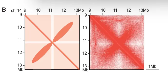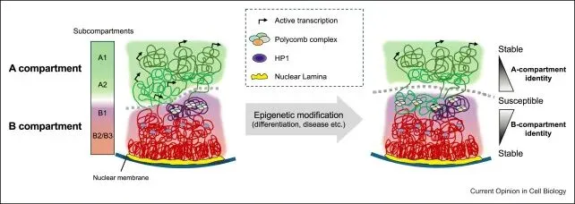 开头碎碎念:又又又又要学新东西而且时间很紧,和大家分享一下一些学习过程中需要理解记忆的基本概念吧。算是新开的一个part除了看的文献之外再做一些拓展,也希望能给大家带来一些帮助参考Rabl-like 构型(Rabl-like configuration):染色体在细胞核中呈现出着丝粒(centomere)聚集于核的一侧,而端粒(telomere)聚集于另一侧的极性排列方式Jet-like染色体互作( jet-like chromatin contacts):在Hi-C图谱中域对角线垂直的线状接触增强,这些结构代表了cohesin推动未受阻双向loop挤出过程,是loop extrusion在Hi-C数据中的动力学呈象特征。Chromosome Territories, CT(染色质领地):是指每一条染色体在细胞核内占据相对独立、非随机的空间区域,不同染色体之间的空间分布具有明显的分隔性,属于整个染色体尺度的空间组织方式,通过FISH等空间成像技术最早发现,为染色体内部更精细的三维结构提供整体架构。是当前认知中最高级最宏观的三维基因组组织形式。A/B compartment(A/B染色质区室):指在单条染色体内部,根据染色质的转录活性状态和空间互作偏好,将基因组划分为转录活跃的A区室和转录抑制的B区室,从而形成的大尺度空间分离结构,尺度通常为Mb级别,A区室倾向于彼此相互接触,B区室依然,常通过Hi-C数据的主成分分析(PC1)识别,与基因表达水平和组蛋白修饰状态高度相关。是染色体领地内部最主要的宏观分区方式之一。在高分辨率Hi-C数据中,A/B区室可进一步细分为多个亚型(如A1、A2、B1、B2等),反映不同程度的转录活性或抑制机制。核结构相关染色质区域(Nuclear structure–associated chromatin):此类宏观组织方式描述的是染色质在细胞核中相对于特定核结构的空间定位特征。核纤层相关结构域(Lamina-Associated Domains, LADs):指与核纤层(nuclear lamina)稳定结合的基因组区域,通常表现为染色质致密、转录活性较低。多与B区室重叠,富集抑制性组蛋白修饰(如H3K9me2/3),在基因表达调控中起到空间抑制作用