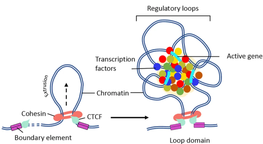 loop(染色质环,Chromtain loop):染色体上两个相距较远的基因组位点在三维空间中发生稳定或半稳定物理接触而形成的局部结构,常见类型有增强子-启动子loop,CTCF-CRCF loop,染色体结构loop,其可以直接调控基因转录,增强子域靶基因的物理基础,快速动态调控。一些结构之间的关联(针对The jet-like chromatin structure defines active secondary metabolism in fungi):jet-like domain(文章中给的新定义):在 Fusarium graminearum(镰刀菌)基因组中,活跃的次级代谢基因簇(BGCs)会形成一种在 Hi‑C 图谱上呈现 “V‑形”或类似喷射状(jet‑like)的局部交互结构域。这些结构域在 Hi‑C 图谱中呈对角线附近对称“喷射状”接触富集;可以向两侧对称延伸(propagate)数十 kb(最多约 54 kb);在全基因组范围内 普遍存在于活跃表达的基因区域;与 高水平基因转录、染色质可及性增强、组蛋白乙酰化标记富集 密切相关;是一种既定的、可识别的染色质局部交互域,而不是仅仅指动态的挤出过程;其形成依赖于组蛋白乙酰转移酶 GCN5 的存在,GCN5 缺失会阻断这些结构域的形成。Ouyang, W., Xiong, D., Li, G., & Li, X. (2020). Unraveling the 3D genome architecture in plants: present and future. Molecular Plant, 13(12), 1676-1693.Asami Oji, Linda Choubani, Hisashi Miura, Ichiro Hiratani. (2024). Structure and dynamics of nuclear A/B compartments and subcompartments, Current Opinion in Cell Biology,Volume 90,2024