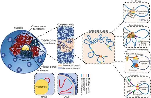 核仁相关结构域(Nucleolus-Associated Domains, NADs): 是指定位于核仁周围的染色质区域,通常富含重复序列和低表达基因。与转录抑制状态相关,在染色体空间定位中具有稳定性。