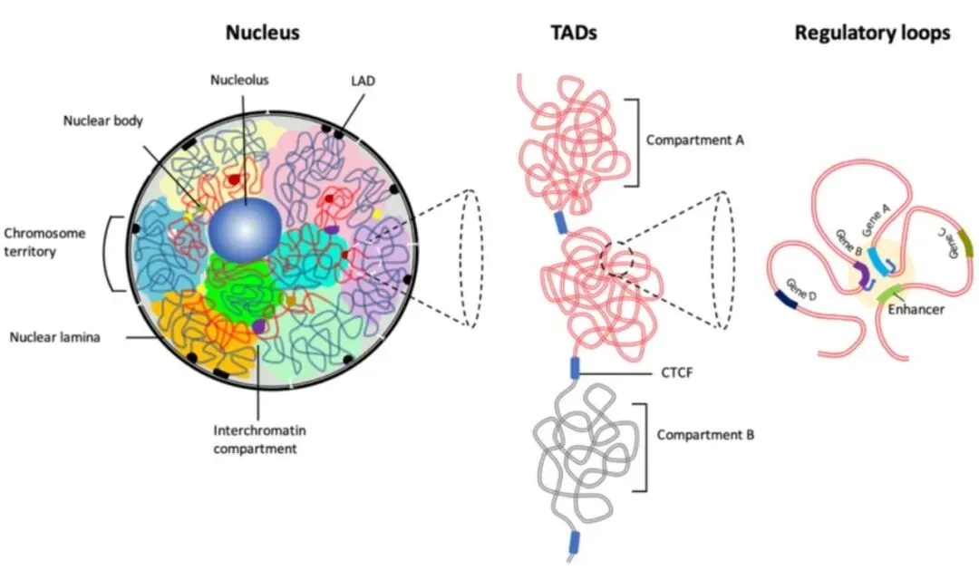 TAD(Topologically Associating Domain,拓扑关联结构域):TAD是染色体在三维空间中形成的中尺度结构单元,其特征是在该区域内部染色质片段之间的相互作用频率显著高于相邻区域的相互作用。是染色质的功能性调控单元。TAD可限制增强子作用范围,增强子通常只调控同一TAD内的基因,保证基因表达的特异性,TAD边界破坏可导致表达异常,TAD边界在不同细胞类型中相对保守,其内部活性状态(表达、histone)可动态变化。