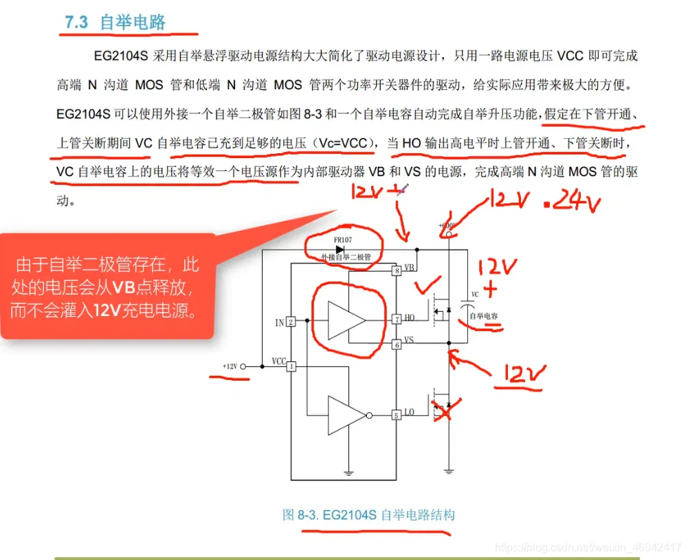总结下来,无论mos管源级Vs如何变化,我们通过自举电路,将栅极Ho处电压,根据源级Vs电压进去抬高,抬高的电压,就是自举电容上的电压,这样就能一直满足Vgs>Vmos的导通电压条件,使Nmos一直在导通状态。