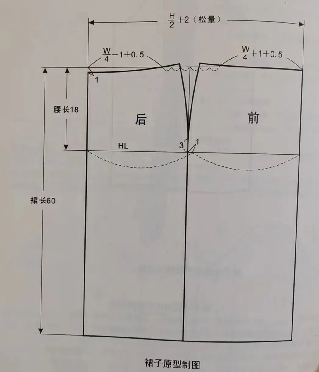 【第二步】画轮廓线(5)前腰宽:按W/4+0.5(吃势)+1(前后腰差)=18.5cm。(6)后腰宽:按W/4+0.5(吃势)-1(前后腰差)=16.5cm。(7)腰、臀围差的处理:先分别把前后腰宽除去后,余下的量就是前后腰围与臀围宽之间的差。如何来处理这种臀腰差,正是我们在设计裙子结构时必须首先考虑的问题。在制作原型时,先把前后臀腰差分别分成三等份,再在前后侧缝中分别劈去其中的1/3。剩下的2/3可用工艺上作“省”缝的方法来处理。(8)前后侧缝起翘:分别在腰线向上起翘0.7cm。(9)后落腰:由后腰中点向下落1cm(这是为修正女性后臀下落,及腰节线前高后低的缘故)。