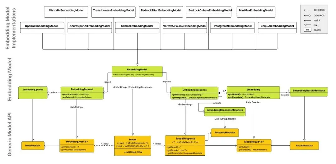 嵌入模型 API 建立在通用的 Spring AI 模型 API 之上,后者是 Spring AI 库的一部分。 因此,嵌入模型接口扩展了型界面,提供了一套标准的方法用于与AI模型交互。这嵌入请求和嵌入响应类别从ModelRequest和模型响应分别用于封装嵌入模型的输入和输出。
