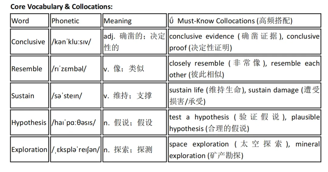 For decades, astronomers have searched for conclusive evidence that Mars once possessed a climate suitable for life. Satellite imagery reveals geological channels that strikingly resemble terrestrial riverbeds, suggesting that liquid water carved these features billions of years ago. Although the planet's current atmosphere is too thin to sustain liquid water on the surface, polar ice caps contain vast reserves of frozen water. Consequently, scientists have proposed the hypothesis that significant quantities of water may still exist underground. If true, these subsurface reservoirs could potentially harbor microbial life, making them a primary target for future exploration.Quick Check (Test Yourself):Synonym Match: In the sentence "geological channels that strikingly resemble terrestrial riverbeds," the word resemble is closest in meaning to:想要文中提到的这套《托福语境记忆30个Topic》完整PDF吗? 我已经打包整理好了,直接打印就能用!