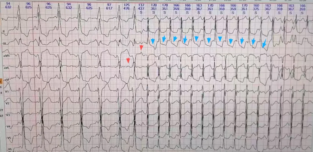 2. 逆传P‘波清晰可见的逆传P‘波,且RP‘间期通常固定,P‘R > RP‘(即“短RP‘心动过速”)。如上图蓝色箭头清晰可见。