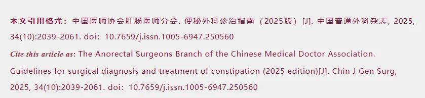 文献来源:中国医师协会肛肠医师分会. 便秘外科诊治指南(2025版)[J]. 中国普通外科杂志, 2025, 34(10):2039-2061. doi:10.7659/j.issn.1005-6947.250560